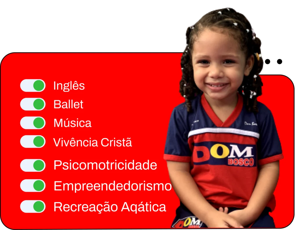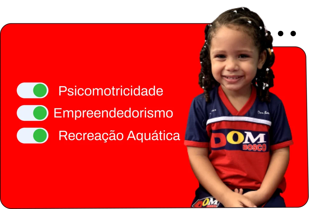 No Dom Bosco, a Educação Infantil contempla todos os campos de experiências propostos pela Base Nacional Comum Curricular (BNCC): escuta, fala, pensamento e imaginação; espaços, tempos, quantidades, relações e transformações; o eu, o outro e o nós; traços, sons, cores e formas; e corpo, gestos e movimentos. Contempla também os componentes curriculares de vivência cristã, Arte, Ballet, Judô, Iniciação Aquática, Psicomotricidade, Inglês, Empreendedorismo Mirim e aula de Música. Desse modo, o Dom Bosco tem como proposta trabalhar de forma integrada os conteúdos, ou seja, promover a articulação entre os campos de experiências em cada série: Maternal I, Maternal II, 1º Período e 2º Período.